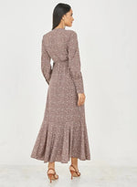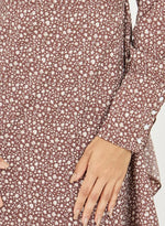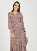 • This brown floral midi dress features long sleeves, a V-neckline, and a flattering wrap silhouette with ruffle detailing.
