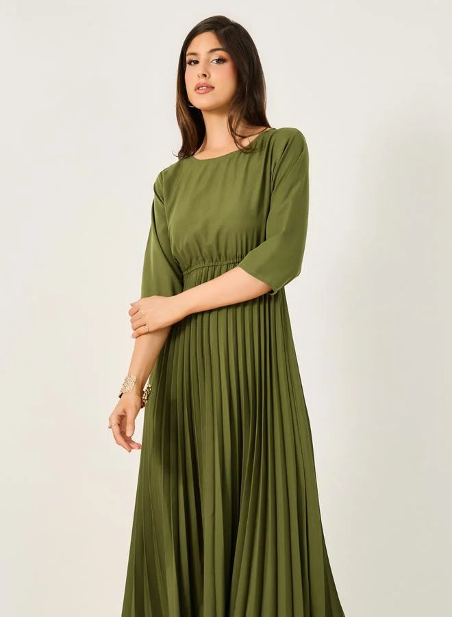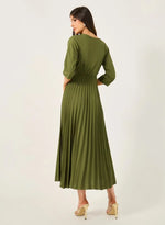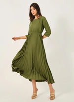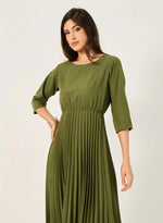 - This olive-green dress features a pleated skirt that flares out from a cinched waistline and a modest round neckline with three-quarter sleeves. The soft fabric drapes gracefully, creating a timeless and elegant silhouette.