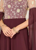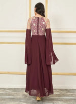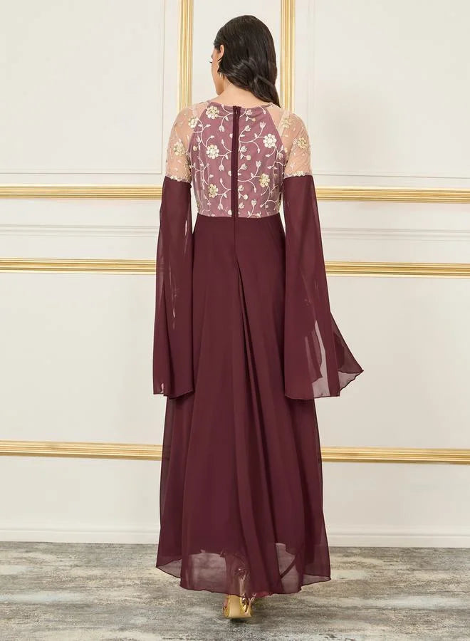 - This chic jumpsuit features a floral embroidered top with flowing sleeves, paired with wide-leg pants in a rich plum hue, offering a sophisticated and stylish look.